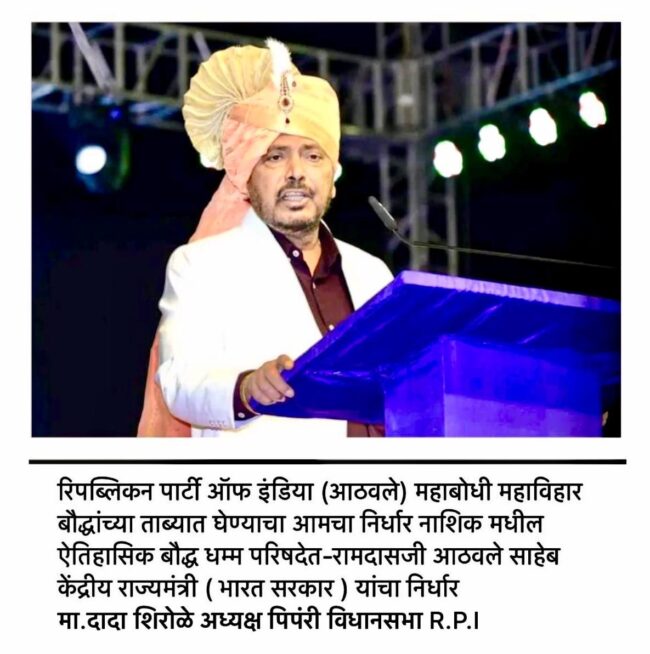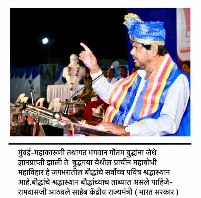 गौतम नगरी चौफेर शिला धोटे मुंबई दि.26 – महाकारुणी तथागत भगवान गौतम बुद्धांना जेथे ज्ञानप्राप्ती झाली ते बुद्धगया येथील प्राचीन महाबोधी महाविहार हे जगभरातील बौद्धांचे सर्वोच्च पवित्र श्रद्धास्थान आहे. बौद्धांचे श्रद्धास्थान बौद्धांच्याच ताब्यात असले पाहिजे. महाबोधी महाविहाराचे संपूर्ण व्यवस्थापन बौद्धांच्या ताब्यात देणे हा नैसर्गिक न्याय ठरेल. त्यामुळे 1949 चा महाबोधी महाविहार व्यवस्थापन कायदा दुरुस्त करून महाबोधी महाविहार व्यवस्थापन समितीत सर्व सदस्य बौद्ध असावेत असा कायदा करुन महाबोधी महाविहार बौद्धांच्या ताब्यात द्यावे अशी रिपब्लिकन पक्षाची मागणी आहे असे सांगत रिपब्लिकन पक्षाचे राष्ट्रीय अध्यक्ष केंद्रीय सामाजिक न्याय राज्यमंत्री ना रामदास आठवले यांनी महाबोधी महाविहार मुक्ती आंदोलनाला जाहीर पाठिंबा व्यक्त केला.