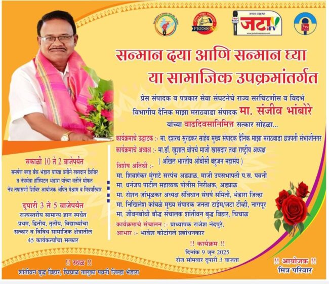 गौतम नगरी चौफेर //भंडारा- प्रेस संपादक व पत्रकार सेवा संघटनेचे राज्य सरचिटणीस व विदर्भ विभागीय दैनिक माझा मराठवाडा वर्तमानपत्राचे संपादक संजीव भांबोरे यांच्या वाढदिवसानिमित्त 9 जून 2025 ला दुपारी 3 वाजता राज्यस्तरीय घेण्यात आलेल्या ऑफलाइन सामान्य ज्ञान स्पर्धेत प्रथम ,द्वितीय ,तृतीय आलेल्या विद्यार्थ्यांचा सत्कार करण्यात येणार आहे. कार्यक्रमाचे उद्घाटन दैनिक माझा मराठवाडा चे मुख्य संपादक दशरथ सुरडकर छत्रपती संभाजी नगर हे करणार आहेत .तर कार्यक्रमाचे अध्यक्षस्थानी माजी खासदार तथा अखिल भारतीय ओबीसी बहुजन महासंघाचे राष्ट्रीय अध्यक्ष डॉ .खुशाल बोपचे हे राहणार आहेत. विशेष अतिथी म्हणून शिवशंकर मुंगाटे सरपंच अड्याळ तथा माजी उपसभापती पंचायत समिती पवनी, सहाय्यक पोलीस निरीक्षक धनंजय पाटील अड्याळ, संविधान संघर्ष समिती भंडारा जिल्हा चे अध्यक्ष रोशन जांभुळकर, जनता टाईम/ जनता टीव्हीचे मुख्य संपादक निखिलेश कांबळे नागपूर,शांतीवन बुद्ध विहार चिचाळ येथील संचालक जीवन बोधी बौद्ध नागपूर हे प्रामुख्याने उपस्थित राहणार .सदर कार्यक्रमात विविध सामाजिक क्षेत्रातील 50 कार्यकर्त्यांचा सत्कार कार्यक्रम त्याचप्रमाणे सकाळी 10 ते 2 वाजेपर्यंत समर्पण ब्लड बँक भंडारा यांच्या वतीने रक्तदान शिबिराचे आयोजन व नेत्रसेवा हॉस्पिटल भंडारा यांच्या वतीने मोफत नेत्र तपासणी शिबिराचे आयोजन पवनी तालुक्यातील शांतीवन बुद्ध विहार चिचाळ येथे