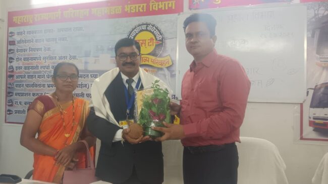 गौतम नगरी चौफेर संजीव भांबोरे भंडारा – महाराष्ट्र राज्य परिवहन महामंडळ भंडारा विभागाच्या वतीने गुणवंत कामगार पुरस्कार सोहळा दिनांक 24/7/2025 ला विभागीय कार्यालय भंडारा येथे आयोजित करण्यात आलेला होता. त्या ठिकाणी मा .श्रीकांत गभणे प्रादेशिक व्यवस्थापक नागपूर प्रदेश यांच्या हस्ते विजय नंदागवळी माजी साहाय्यक वाहतूक अधीक्षक यांना शाल, स्मृती चिन्ह, श्रीफळ देऊन सन्मानित करण्यात आले.