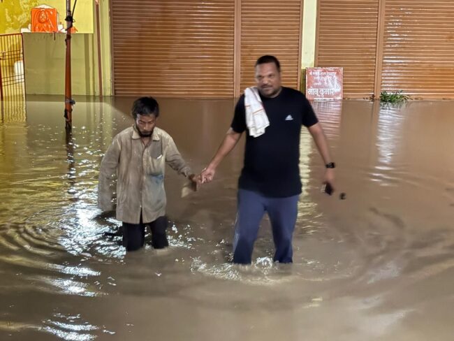 फोटो : 2) हनुमान मंदिरात अडकलेल्या मतिमंद प्रमोद गटलेवार या युवकाला पाण्यातून बाहेर काढताना पत्रकार सागर भटपल्लीवार