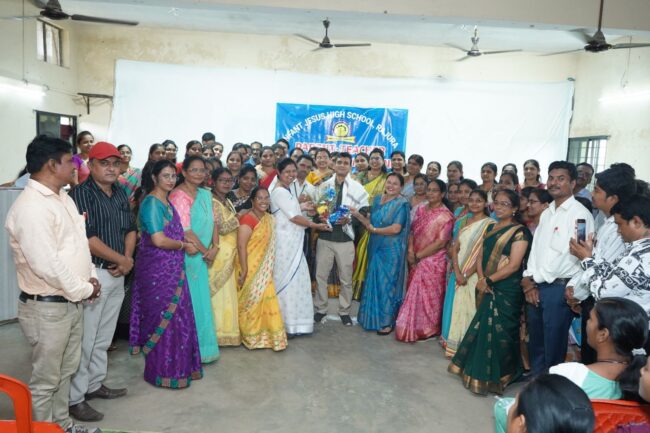 गौतम नगरी चौफेर बादल बेले राजुरा :- इन्फंट जीजस सोसायटी द्वारा संचालित इन्फंट जीजस इंग्लिश हायस्कूल राजुरा येथे शिक्षक व पालक यांची सहविचार सहभाग घेऊन शिक्षक – पालक संघातील प्रतिनिधीची निवड करून संघाचे गठण करण्यात आले. यावेळी शिक्षक – पालक संघातील नवनियुक्त प्रतिनिधीचे पुष्पगुच्छ देऊन स्वागत करण्यात आले. या संघातील सदस्यांशी परस्पर संवाद कायम ठेवून विद्यार्थ्यांच्या शैक्षणिक प्रगतीसाठी काम करण्याचा संकल्प घेण्यात आला