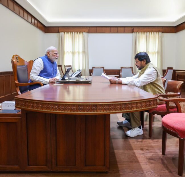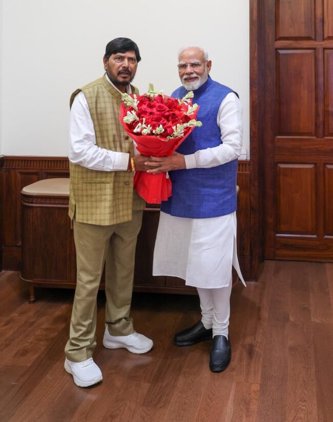 प्रधानमंत्री नरेंद्र मोदी यांच्यासोबत ना.रामदास आठवले यांनी 10 मिनिटे चर्चा केली. यावेळी सिन्दुर ऑपरेशन द्वारे प्रधानमंत्री नरेंद्र मोदी यांनी पाकिस्तानी दहशतवादी अड्डे नष्ट करण्याची केलेली कामगिरी उत्कृष्ट असून त्याबद्दल सर्व देशवासी आपले आभार मानत असल्याचे सांगत ना. रामदास आठवले यांनी प्रधानमंत्र्यांचे सिन्दुर ऑपरेशन केल्याबद्दल अभिनंदन केले.