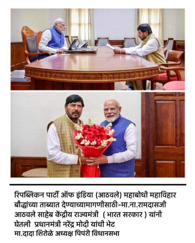 गौतम नगरी चौफेर (गौतम धोटे) – नवीदिल्ली / मुंबई दि.8 ~ महाकारुणी तथागत भगवान गौतम बुद्धांना बुद्धगया येथील महाबोधी वृक्षाखाली ज्ञानप्राप्ती झाली त्या परमपवित्र स्थळी महाबोधी महाविहार उभारण्यात आले आहे. जगभरातील बौद्धांचे सर्वोच्च श्रद्धास्थान बुद्धगया येथील महाबोधी महाविहार आहे. त्याची विश्वस्त व्यवस्था ही 1949 च्या बी टी ऍक्ट नुसार चालते त्यात 4 बौद्ध आणि 4 हिंदू ट्रस्टी असून कलेक्टर चेअरमन असतो. त्यात बदल करून सर्व ट्रस्टी आणि चेअरमन हे बौद्धच असले पाहिजेत असा कायदा करून महाबोधी महाविहार बौद्धांच्या ताब्यात द्यावे अशी आग्रही मागणी आज रिपब्लिकन पक्षाचे राष्ट्रीय अध्यक्ष केंद्रीय सामाजिक न्याय राज्यमंत्री ना रामदास आठवले यांनी प्रधानमंत्री नरेंद्र मोदी यांची संसदेत भेट घेऊन केली.
