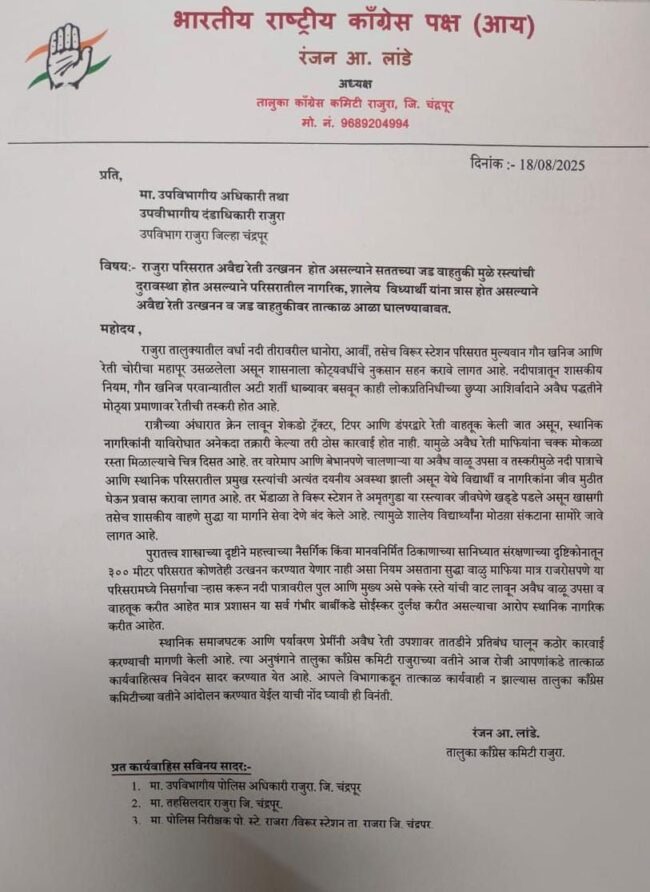या गंभीर पार्श्वभूमीवर, तालुका काँग्रेस कमिटी राजुरा यांच्या वतीने उपविभागीय अधिकारी, तहसीलदार व पोलीस निरीक्षक यांना निवेदन सादर करून तातडीने अवैध रेती उपसा व वाहतुकीवर आळा घालावा, अशी मागणी करण्यात आली. तसेच तात्काळ कठोर कारवाई न झाल्यास जोरदार आंदोलन उभारण्याचा इशारा काँग्रेसतर्फे देण्यात आला आहे.