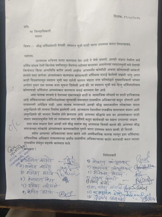 आमच्या बौद्धांचे शव जर अंत्यसंस्कारा साठी भंडारा स्मशानभुमीत गेले तर त्यांच्यावर नगर परिषदे कडून कार्यवाही चा बडगा उगारल्या जाइल . सदर बाब लक्षात घेता आम्ही सर्व बौद्ध समाज बंधु आपणास विनंती करतो की, आमच्या बौद्ध समाजाच्या लोकांचे अंत्यसंस्कार करण्याकरिता दूसरी जागा उपलब्ध करुन द्यावी, ही विनंती.