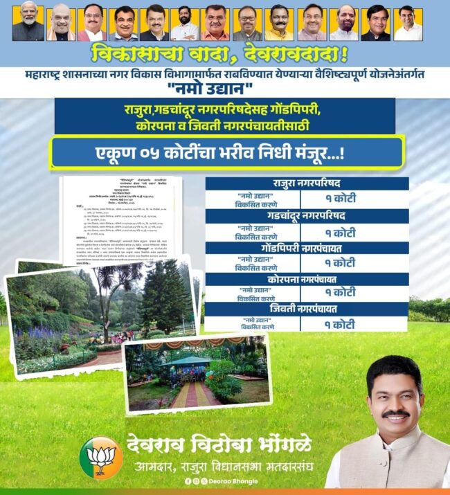 गौतम नगरी चौफेर बादल बेले राजुरा, (प्रतिनिधी) : राजुरा मतदार संघातील राजुरा, गडचांदूर, कोरपना, जिवती आणि गोंडपिपरी या सहा महत्त्वाच्या ठिकाणी पर्यावरण संवर्धन आणि स्थानिक नागरिकांसाठी हरित मोकळी जागा उपलब्ध करून देण्याच्या उद्देशाने ‘नमो उद्यान’ साकारण्याचा महत्त्वपूर्ण निर्णय राज्य शासनाने घेतला आहे. आमदार देवराव भोंगळे यांच्या सातत्यपूर्ण पाठपुराव्यामुळे या मागणीला यश आले असून, राजुरा विधानसभेतील प्रत्येक नगरपरिषद व नगरपंचायत क्षेत्रात या उद्यानासाठी शासनाकडून ०१ कोटी रुपयांचा निधी मंजूर करण्यात आला आहे.