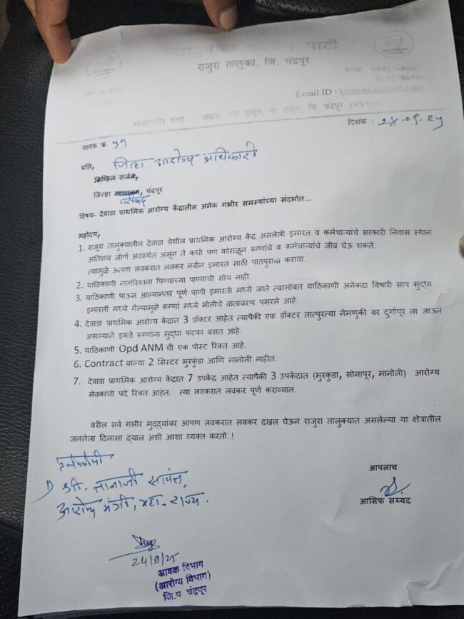 तसेच दोन सिस्टर भुरकुंडा आणि मानोली नाहीत. देवाडा प्राथमिक आरोग्य केंद्रात 7 उपकेंद्र आहेत त्यापैकी 3 उपकेंद्रात (भुरकुंडा, सोनापूर, मानोली) आरोग्य सेवकांची पदे रिक्त आहेत. वरील सर्व रिक्त पदे भरण्यात याव्यात व त्या पैकी नियुक्त झालेल्या कर्मचार्यांचे पदग्रहण लवकरात लवकर करावे. अशा समस्त गंभीर मुद्द्यांवर आपण लवकरात लवकर दखल घेऊन राजुरा तालुक्यात असलेल्या या क्षेत्रातील जनतेला दिलासा द्याल अशी मागणी संबंधित अधिकार्यांना करण्यात आली. संबंधित अधिकार्यांनी येणार्या 10 दिवसात पिण्याच्या पाण्याचे प्रश्न सोडविण्याचे, जीर्ण इमारती साठी लवकरात लवकर पाठपुरावा तसेच इतर सर्व मुद्द्यांवर तातडीने दखल घेतली जाईल असे आश्वासन यावेळी दिले. यावेळी राष्ट्रवादीचे जिल्हाध्यक्ष राजेंद्र वैद्य, तालुका अध्यक्ष आसिफ सय्यद, राष्ट्रवादी युवक काँग्रेसचे तालुकाध्यक्ष प्रणय धोटे तालुका महासचिव साहिल शेख तथा अयान शेख उपस्थित होते.