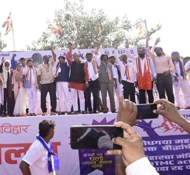 बुद्धगया येथील महाबोधी महाविहार मुक्त करून बौद्धांच्या ताब्यात द्यावे या मागणीसाठी आज 14 ऑक्टोबर रोजी धम्मचक्र प्रवर्तन दिनाचे औचित्य साधून सर्व पक्षीय बौद्ध नेते सर्व रिपब्लिकन गट आणि सर्व बौद्ध संघटनांच्या एकजुटीतून महाबोधी महाविहार मुक्ती आंदोलन कृती समिती च्या वतीने रिपब्लिकन पक्षाचे राष्ट्रीय अध्यक्ष केंद्रीय सामाजिक न्याय राज्यमंत्री ना. रामदास आठवले यांच्या नेतृत्वात मेट्रो सिनेमा ते आझाद मैदान असा विराट मोर्चा काढण्यात आला. या विराट मोर्चात राज्यातील सर्व आंबेडकरी बौद्ध जनतेने रखरखत्या उन्हात विराट शक्तिप्रदर्शन घडविले. या बौद्ध जनतेच्या एकजुटी च्या मोर्चात राजकारणा पलीकडे जाऊन सर्व पक्षीय बौद्ध नेते एकजूट झाले होते. यावेळी पूज्य भदंत डॉ राहुल बोधी महाथेरो; भंते विनाचार्य भदंत हर्षवोधी, आकाश लामा, आदी भिक्खू संघ उपस्थित होते.