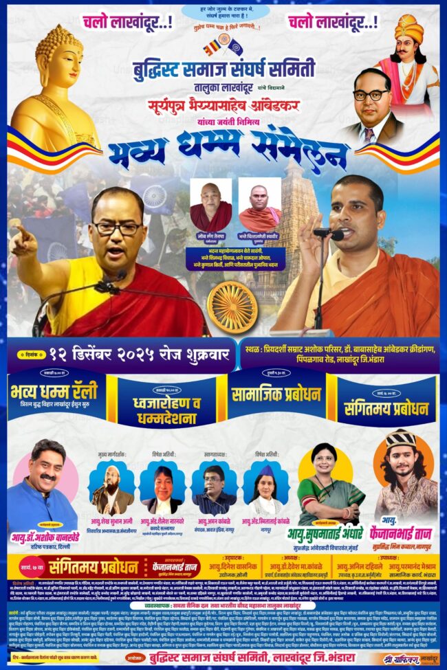 गौतम नगरी चौफेर संजीव भांबोरे भंडारा – लाखांदूर येथे बुद्धिस्ट समाज संघर्ष समिती च्या वतीने सूर्यपुत्र भैय्यासाहेब आंबेडकर यांच्या जयंतीनिमित्त 12 डिसेंबर 2025 शुक्रवारला सकाळी ७ वाजता धम्म रॅलीचे आयोजन त्रिरत्न बुद्ध विहार लाखांदूर येथून सुरू करण्यात येईल. कार्यक्रमाचे आयोजन प्रियदर्शी सम्राट अशोक परिसर डॉ. बाबासाहेब आंबेडकर क्रीडांगण पिंपळगाव रोड लाखांदूर येथे आयोजित करण्यात आलेले आहे. सदर कार्यक्रमानिमित्त बोधगया येथील महाबोधी महाविहार मुक्ती आंदोलनाचे प्रणेते भदंत विनाचार्य, लोब सांग तेनपा, भंते चित्त ज्योती स्थवीर, भदंत महामोगलायन थेरोसावंगी ,भंते शीरभद्र चीचाळ, भदंत चारुदत्त ओपारा, भदंत कुणाल कीर्ती, यांचे नेतृत्वात धम्म रॅलीचे