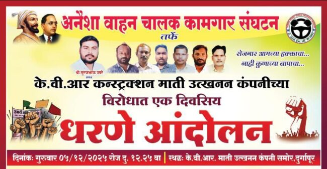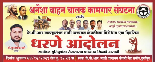 गौतम नगरी चौफेर (अशोककुमार उमरे) – दुर्गापूर वेकोली कोळसा खदानीत कार्यरत केव्हीआर कन्स्ट्रक्शन या माती उत्खनन कम्पनीत स्थानिक भुमिपुत्राना प्राधान्य द्यावे या मागणीसाठी अनैशा वाहन चालक कामगार संघटनेच्या वतीने तारीख ५ डिसेंबर २०२५ ला एकदिवसीय धरणे आंदोलन करण्यात येत आहे.