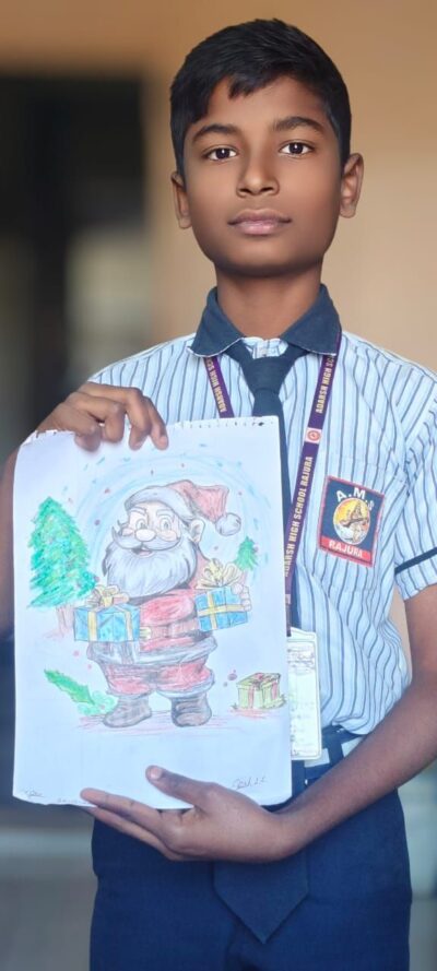 गौतम नगरी चौफेर बादल बेले राजुरा – २३ डिसेंबर बालविद्या शिक्षण प्रसारक मंडळ राजुरा द्वारा संचालित आदर्श मराठी प्राथमिक विद्यामंदिर राजुरा येथील इयत्ता आठवीत शिकणाऱ्या दानिश शकील शेख या विद्यार्थ्याने ख्रिसमस नाताळ निमित्याने सॅन्टाक्लॉज चे सुंदर चित्र रेखाटले. विशेष म्हणजे कोणत्याही प्रकारचे चित्रकलेचे प्रशिक्षण न घेता हा विद्यार्थी वेगवेगळे चित्र रेखाटतो. त्याने डॉ. बाबासाहेब आंबेडकर, भगत सिंग, महात्मा गांधी अशा समाजसुधारक, क्रांतिकारकांचे चित्र रेखाटले आहे. त्याला अभ्यासाव्यतिरिक्त चित्रकलेची आवड असून तो सतत नवनवीन चित्र काढत असतो. याकरिता त्याला राष्ट्रीय हरित सेना विभाग प्रमुख शिक्षक बादल बेले यांनी प्रोत्साहन दिले असून पुढेही त्याला चित्रकलेची आवड पूर्ण करण्यासाठी लागणारे साहित्य भेट देण्यात येईल असे सांगितले. शाळेच्या मुख्याध्यापिका नलिनी पिंगे, वर्गशिक्षिका वैशाली चिमुरकर यांनी सुद्धा या विद्यार्थ्याला त्याने काढलेल्या चित्रांकरिता शुभेच्छा दिल्या आहेत.