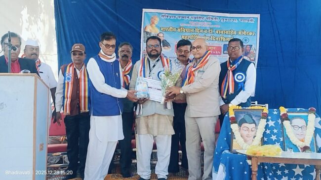 गौतम नगरी चौफेर संजीव भांबोरे नागपूर : चंद्रपूर जिल्ह्यातील भद्रावती तालुक्यात सुमठाना येथे भारतीय राज्यघटनेचे शिल्पकार – डॉ.बाबासाहेब आंबेडकर यांच्या संविधान दिन व महापरिनिर्वाण दिनानिमित्त दिनांक 28 डिसेंबर २०२५ रोज रविवारला स्थळ तथागत बुद्ध विहार नवीन सुमठाना तालुका भद्रावती जिल्हा चंद्रपूर येथे भारतीय संविधान सन्मान राष्ट्रीय गौरव पुरस्काराचे आयोजन करण्यात आले होते. या कार्यक्रमाचे अध्यक्ष अविनाश टिपले, कार्यक्रमाचे उद्घाटक रमेशचंद्र राऊत यांच्या हस्ते पार पडले. प्रमुख मार्गदर्शक ज्येष्ठ साहित्यिक मधुकरराव बावनकर, एडवोकेट पुनम वाघमारे, डॉक्टर अजय दहेगावकर, माजी जिल्हा परिषद सदस्य विजय वानखेडे, प्रवीण कवाडे, प्रबोधनकार भीम शाहीर प्रदीप कडबे, माजी समाज कल्याण सभापती बिजभुषन पाझारे, श्रीधर भगत, प्रभाकर डोंगरे , माजी नगरसेवक राहुल चौधरी, नितीन मेश्राम, ज्येष्ठ साहित्यिक सु. वी. साठे, यशवंत लिपटे, माजी नगरसेवका सीमा ढे ग डे, माजी नगरसेविका ज्योती भगत, विकास दुर्योधन, प्रवीण कवाडे, नाना देवगडे, इत्यादी मान्यवरांच्या हस्ते तथागत भगवान गौतम बुद्ध व डॉक्टर बाबासाहेब आंबेडकर यांच्या प्रतिमेचे पूजन करून पुष्पहार अर्पण करून अभिवादन करण्यात आले. याप्रसंगी नागपूर जिल्ह्यातील रामटेक तालुक्यातील किरणापुर येथील प्रबोधनकार भीम शाहीर प्रदीप बागवान कडबे यांच्या पुष्पगुच्छ प्रमाणपत्र स्मृतीचिन्ह देऊन – भारतीय संविधान सन्मान राष्ट्रीय गौरव पुरस्कार 2025 ने सन्मानित करण्यात आले. या कार्यक्रमाला महाराष्ट्राचे सुप्रसिद्ध कवी के पाटील वर्धा, ज्येष्ठ समाजसेवक सुफी सय्यद शमशो दी न, बी आर ढगे, पत्रकार संतोष सोनवा ने, प्राध्यापक महादेव ग पा ट, महाराष्ट्राचे सुप्रसिद्ध गायक सदानंद मोरे अकोला, मी रमाई बोलते एकांकिका कलाकार शिफा पवार, प्रबोधनकार सुभाष मानवटकर, गायत्री रामटेके, कार्यक्रमाचे मुख्य आयोजक कवी गायक आनंद भगत यांनी केले होते. कार्यक्रमाचे संचालन प्रभाकर डोंगरे यांनी तर कार्यक्रमाचे आभार मधुकरराव बावलकर यांनी केले, यावेळी मोठ्या संख्येने समाज बांधव, गावातील नागरिक, गायक, कलावंत उपस्थित होते.