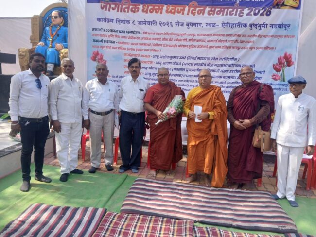 गडचांदूर येथील ऐतिहासीक बुध्दभुमी येथील धम्माध्वजदिन समारोहदिन साजरा करण्यात आला. त्यावेळी ते उपासक –उपासिकांना मागील माहीती सांगत — बोलत अशोक उमरे होते. यावेळी कार्यक्रमाचे अध्यक्ष-आयु. अशोककुमार उमरे (रिपाई महाराष्ट्र प्रदेश सरचिटणीस तर कार्यक्रमाचे उदघाटक-आयु. श्रावणजी जीवने (अध्यक्ष भारतीय बौद्ध महासभा कोरपना तालुका ,जिल्हा चंद्रपूर) प्रास्ताविक – आयु. गौतम भमारकर (पंचशील युगप्रवर्तक बहुहितकारी संस्था हरदोना खु) कार्यक्रमाचे स्वागताध्यक्ष -आयु. सुरज उपरे (संस्थापक /अध्यक्ष अनैशा वाहनचालक कामगार संघटना हरदोना जी चंद्रपूर) प्रमुख मार्गदर्शक- प्रा.डॉ. सोमाजी गोंडाणे, प्रा. डॉ. विद्याधर बनसोड साहित्यिक तथा आंबेडकरी विचारवंत), विवीध पक्षातिल कार्यकर्त्या व आंबेडकरी विचारवंत चंद्रपूर), आयु. मधू वावनकर (सामाजिक कार्यकर्ते तेलंगणा), आयु. अपेक्षा पिंपळे (सामाजिक कार्यकर्ते), आयु.जी. एस. कांबळे (सामाजिक कार्यकर्ते), आयु. रमेश पाटील सर, आयु, चांगदेव उपरे, आयु. सोमाजी मुन, आयु. भीमदास गायकवाड, आयु. अजय मानवटकर (कामगार नेते), आयु, उत्तमराव बालखंडे, सूत्र संचालन-आयु. भानुदास पाटील यांनी केले तर आभार आयु. किशोर डोंगरे यांनी केले यावेळी या कार्यक्रमाचे छायचिञ गौतम नगरी चौफेरचे संपादक शिला धोटे यांनी घेतले, आयोजक जोगाई तथा बुद्धभूमी विकास व संवर्धन समिती, गडचांदूर अध्यक्ष आयु. दशरथ डांगे ,कार्याध्यक्ष आयु. प्रभाकर खाडे, उपाध्यक्ष आयु. प्रकाश भसारकर, आयु सचिव . किशोर डोंगरे, सहसचिव आयु. पंडित डोंगरे, कोषाध्यक्ष आयु. प्रा. भानुदास पाटील व अगद दुसऱ्या सत्रात सकाळी ११ : ०० वाजता भदंत धम्मसारथी मुख्य धम्म प्रशिक्षक, धम्म प्रशिक्षक भंते राहुल, धम्म प्रशिक्षक भंते राहुलबोधी, धम्म प्रशिक्षक बुद्धवंश बोधीसत्व डॉ. बाबासाहेब आंबेडकर, बुद्धीस्ट सेमिनारी नागपूर यांनी धम्मदेसना दिली.यावेळी समाज क्रांती आघाडी चंद्रपूरचे जिल्हा अध्यक्ष सागर बोरकर व अन्य मान्यवर.