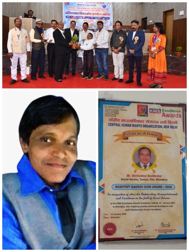 तसेच या प्रसंगी समाजात निर्भीडपणे व सातत्याने सामाजिक कार्य करणाऱ्या समाजसेवक श्रीकृष्ण एस.देशभ्रतार यांचा केंद्रीय मानवाधिकार संघटन, नवी दिल्ली द्वारा” राष्ट्रीय गौरव आयकॉन पुरस्कार – २०२६” देऊन सन्मानित करण्यात आले. या कार्यक्रमास केंद्रीय मानवाधिकार संघटन, नवी दिल्लीचे राष्ट्रीय अध्यक्ष डॉ. मिलिंद दहिवले, राष्ट्रीय कार्याध्यक्ष ॲड. विजयकुमार कस्तुरे, महाराष्ट्र प्रदेशाध्यक्ष डॉ. देवानंद नंदागवळी, जिल्हा सरकारी वकील ॲड. विनोद भोले, भंडारा जिल्हा बार असोसिएशनचे अध्यक्ष ॲड. नितीन रहांगडाले, कार्यकारी अभियंता श्री. व्ही. एस. चुरहे यांच्यासह विविध क्षेत्रांतील मान्यवर उपस्थित होते.
