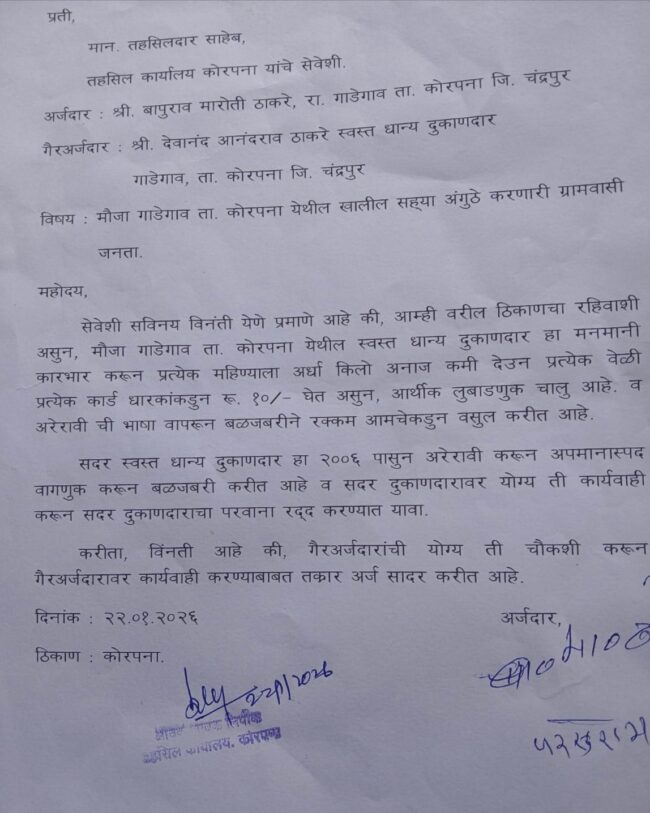 गौतम नगरी चौफेर – गाडेगावात स्वस्त धन्य दुकाणदाराकडून आर्थिक लुभाडणुक चालू व अपमानास्पद वागणुक असल्याचा आरोप असल्याचा आरोप करित कोरपना तहसीलदार यांच्या दालनात अर्जदार तगादा लावून सांगत होते या गैरअर्जदाराची चौकाशी करून दुकानाचा परवाना रद्द करण्याची मागणी येथील बापुराव मारोती ठाकरे यांनी केली असुन सोबत परसुरांम लोहे आणी ४२ लोकांचा आरोप असुन या गैर अर्जदारावर चौकाशी करून दंडात कारवाई येथी नागरीकांनी अन्य पुरोवठा अधिकाऱी यांच्या कडे लावून धरली आहे, परवाना रद्द न केल्यास आमी या लोकांना सोबत घेऊन आमरण उपोशन करणार असल्याचे लोकप्रिय (गौतम नगरी चौफेर यां ना सांगितले आहे, गेल्या 2006 पासून हा प्रत्येकी वजनावर अर्धा किलो अनाज कमी देत आहे आणी दम्क देतो की माझे कुणीही वाकड करीत नाही सर्व संबधितअधिकारी आम्हा स्वस्त दुकानदाराकडून हप्प्ता घेतो आणी आमी देतोही या अशा पोकळ कार्डधारकांना दमक देत असल्याचेही बापुरावजी ठाकरे यांनी आज दि. २८/१/२०२६ बुधवार या दरम्यान अर्घा किलो कमी व प्रत्येक कार्डा धारकांकडून १०रू घेतले.