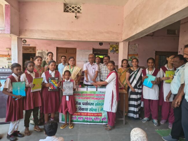 सावित्रीबाई फुले विद्यालय तथा कनिष्ठ महाविद्यालय गडचांदूर येथे विद्यालयाचे सेवानिवृत्त मुख्याध्यापक तथा प्राचार्य महेंद्रकुमार ताकसांडे यांच्या वतीने तसेच भारतरत्न डॉ. बाबासाहेब आंबेडकर यांच्या १३५ व्या जयंती निमित्त विद्यालय व कनिष्ठ महाविद्यालयातील सर्व विद्यार्थ्यांना नोटबुक व पेनचे वाटप करण्यात आले. कार्यक्रम दि. ७ एप्रिल रोजी सकाळी विद्यालयाच्या सभागृहात पार पडला. सदर कार्यक्रमाच्या अध्यक्षस्थानी शाळेचे विद्यमान मुख्याध्यापक तथा प्राचार्य एस. बी. गाडगे होते. तर प्रमुख अतिथी राजेश मांढरे, सुनैना तांबेकर, नागपूर विभाग महिला अध्यक्षा, नैसर्गिक पर्यावरण संवर्धन व मानवता विकास संस्था, अरुणा सालवटकर, संघमित्रा ताकसांडे तसेच नैसर्गिक पर्यावरण संवर्धन व मानवता विकास संस्थेचे पदाधिकारी तसेच सावित्रीबाई फुले विद्यालयाचे मुख्याध्यापक तथा प्राचार्य महेंद्रकुमार ताकसांडे उपस्थित होते. याप्रसंगी वर्ग ५ ते १२ वी पर्यंतच्या शाळेतील सर्व विद्यार्थ्यांना मान्यवरांच्या हस्ते नोटबुक व पेनचे वितरण करण्यात आले. कार्यक्रमासाठी संस्थेचे अध्यक्ष डॉ. आनंदराव अडबाले, सचिव नामदेवराव बोबडे तसेच सर्व संचालकांनी शुभेच्छा दिल्या. कार्यक्रमाचे प्रास्ताविक संघमित्रा ताकसांडे यांनी केले. सूत्रसंचालन शाळेच्या शिक्षिका कु. माधुरी उमरे यांनी तर आभार जीवन आडे यांनी मानले. कार्यक्रमाच्या यशस्वीतेसाठी सावित्रीबाई फुले विद्यालयातील सर्व शिक्षक, शिक्षिका, शिक्षकेत्तर कर्मचारी, विद्यार्थी अथक परिश्रम घेतले.